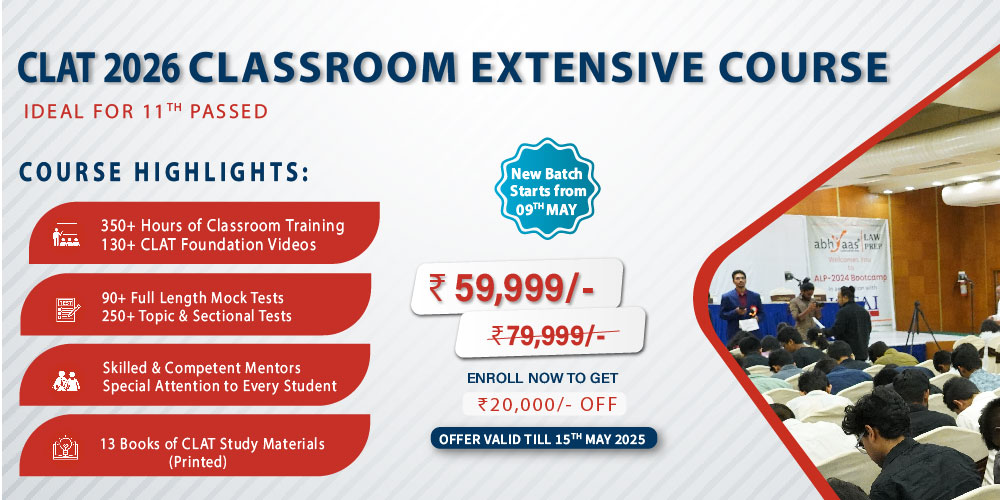 | 10-Apr-2026 | CLAT 2027 EXTENSIVE | Fri(05:00 PM - 07:00 PM) Sat(05:00 PM - 07:00 PM) Sun(9:00 AM - 11:00 AM) | 4/40 (*Available) | FRIDAY TO SUNDAY | REGISTER NOW |